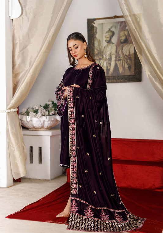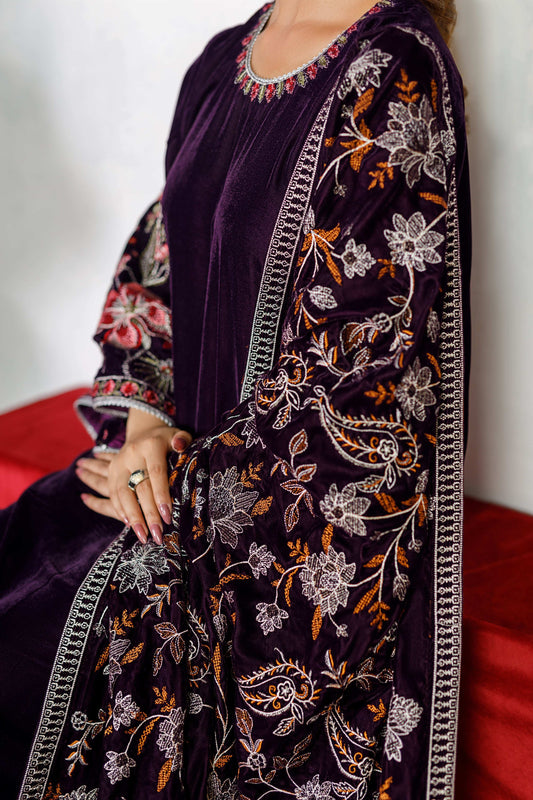 Purple Velvet Shawl with All-Over Tilla Embroidery
