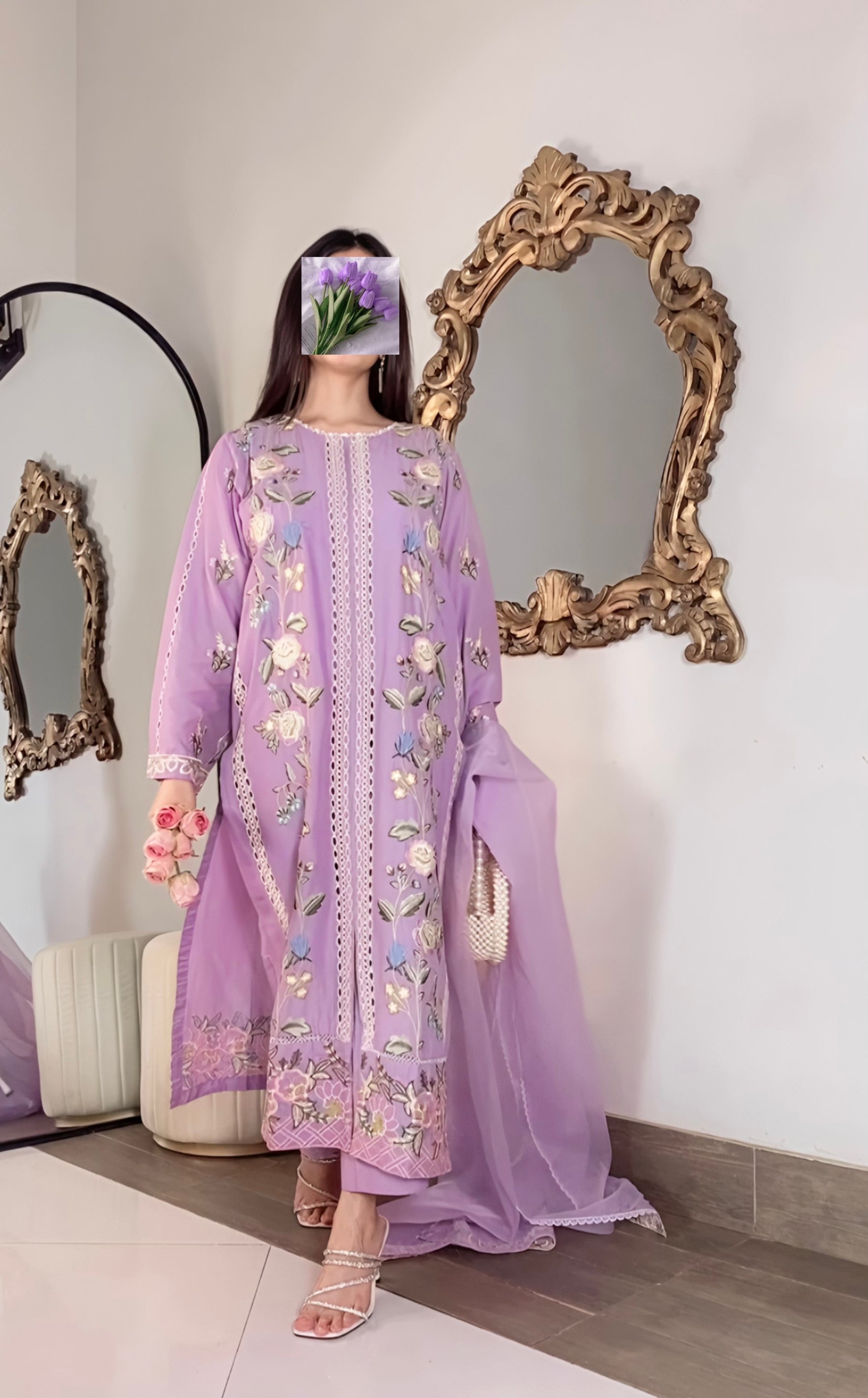 This is a 3-piece embroidered lawn dress in mustard. It comes with an organza dupatta that has light embroidery on both sides. The long shirt has chikankari-inspired embroidery in the middle panel with a cut design and pretty floral threadwork all over. Paired with a long plain trouser, this outfit is minimal, rustic, and graceful for any occasion.