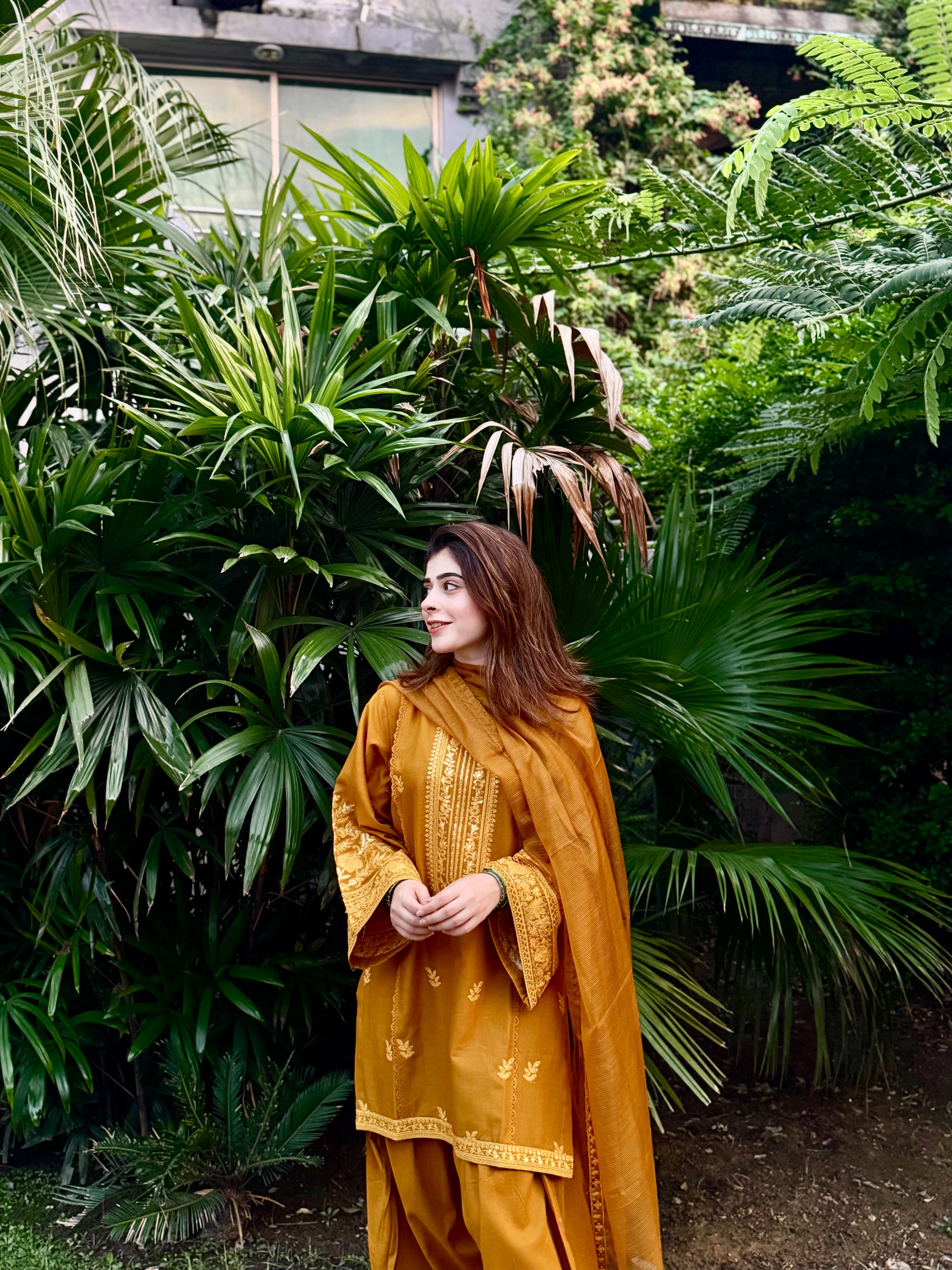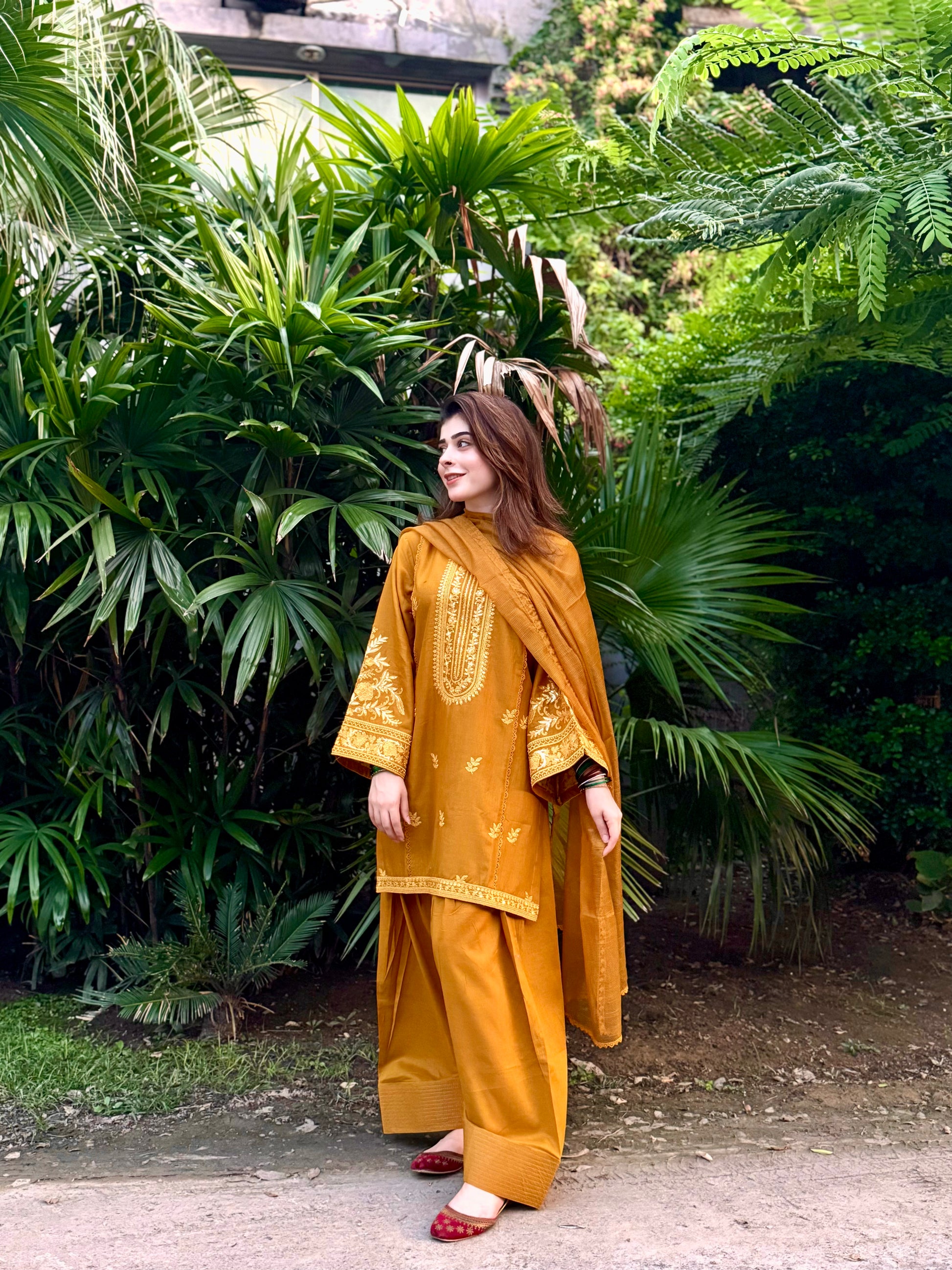 Make a statement in our Spice Red Farshi Shalwar set, featuring intricate embroidery on sleeves and daman with a beautiful gol daman design. Paired with a stunning chiffon dupatta adorned with embroidered motifs, perfect for any occasion.