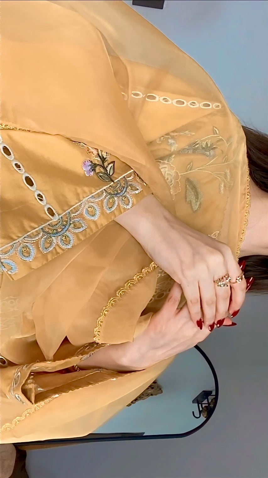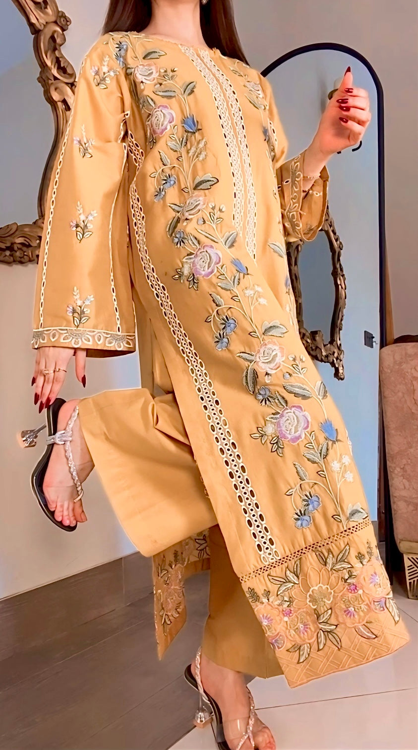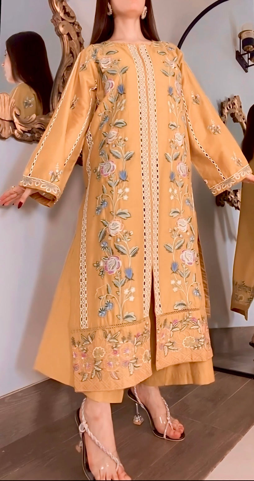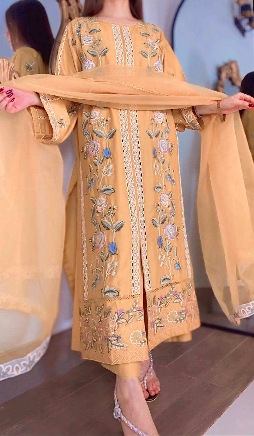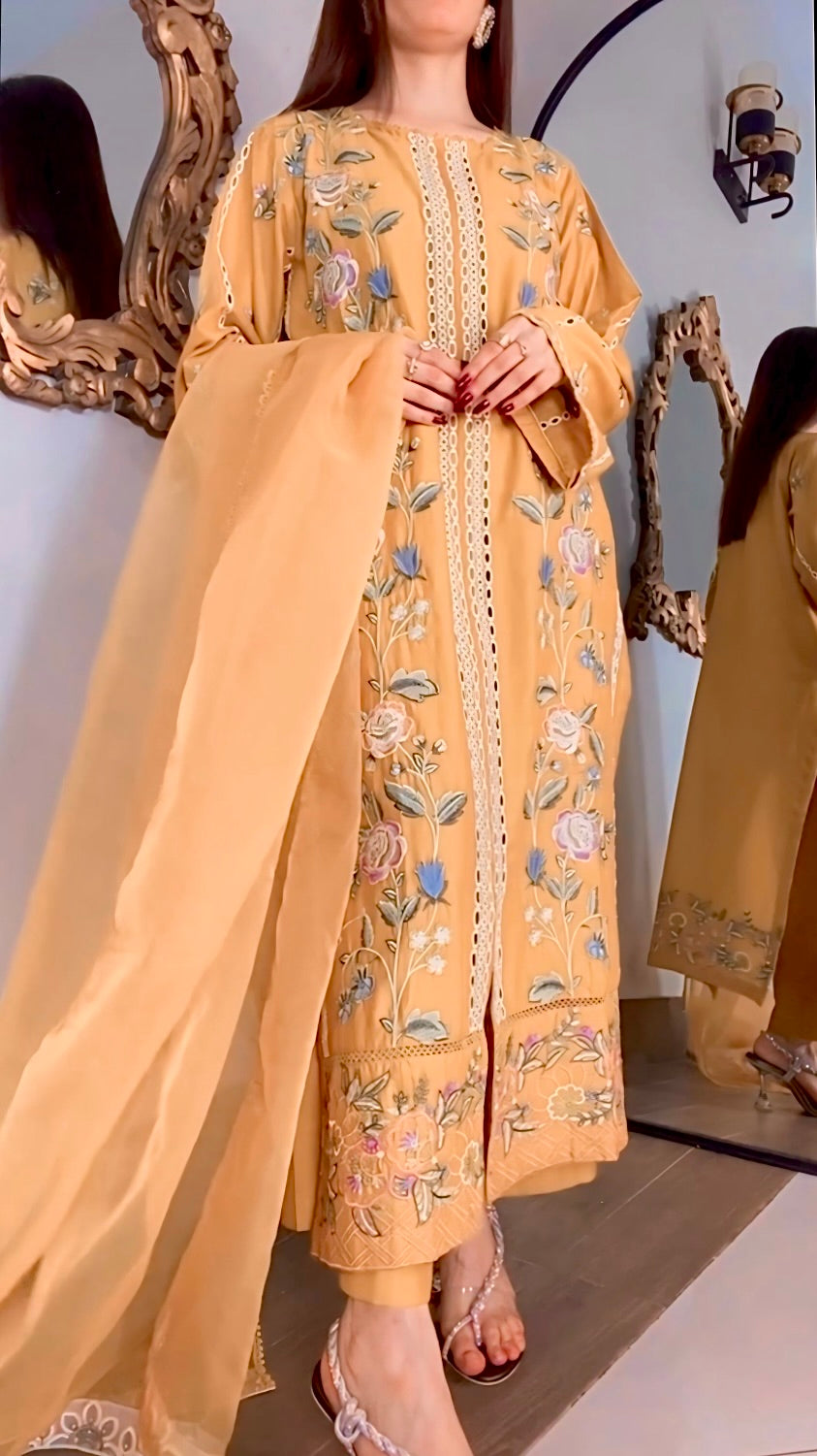 This is a 3-piece embroidered lawn dress in mustard. It comes with an organza dupatta that has light embroidery on both sides. The long shirt has chikankari-inspired embroidery in the middle panel with a cut design and pretty floral threadwork all over. Paired with a long plain trouser, this outfit is minimal, rustic, and graceful for any occasion.