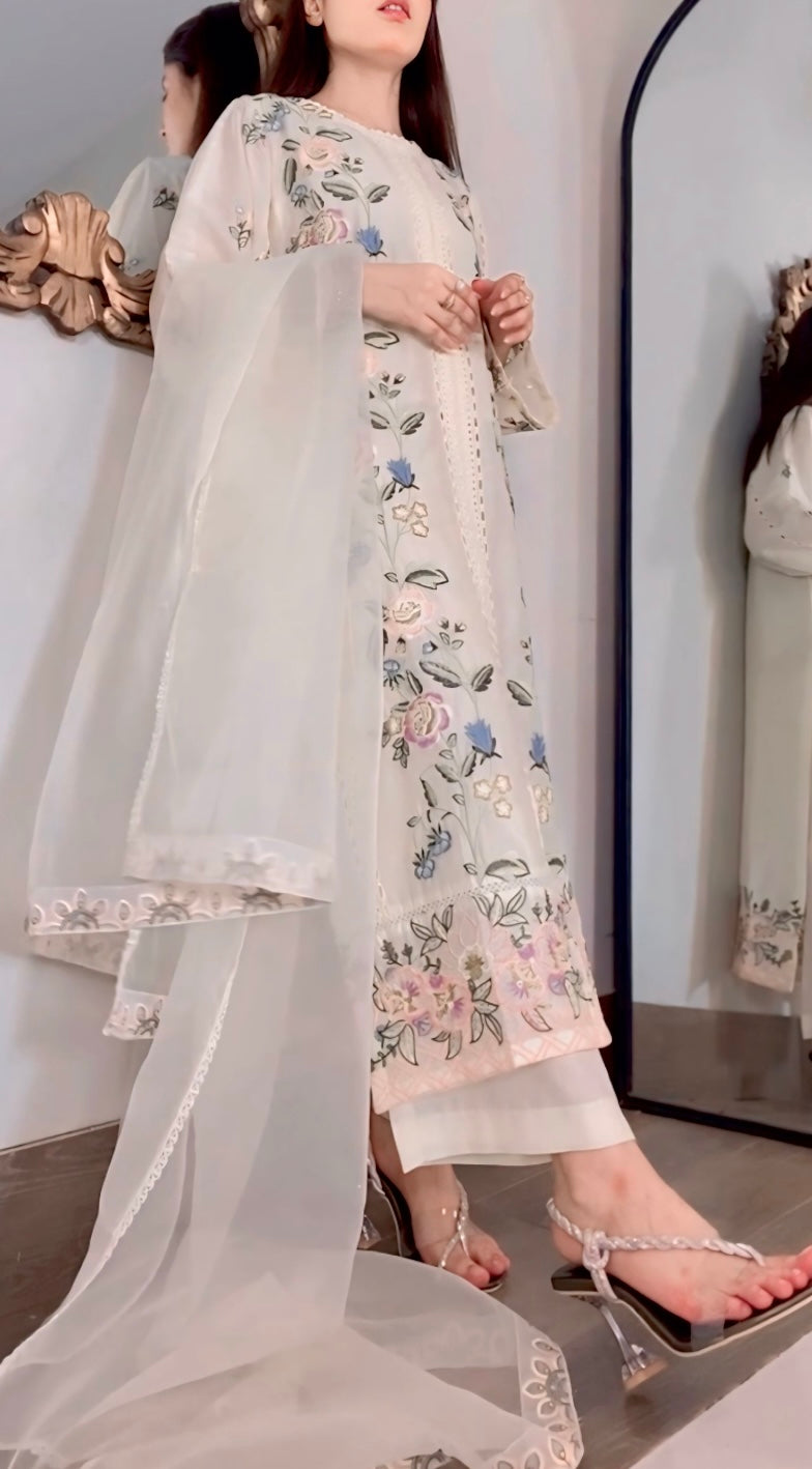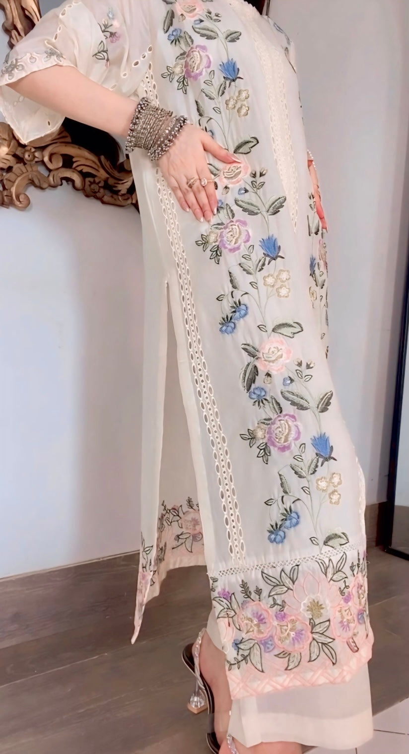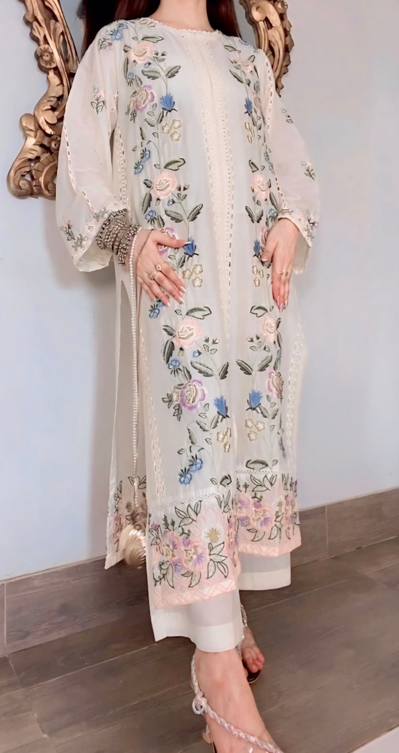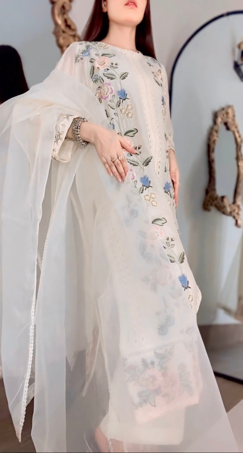 This is a 3-piece embroidered lawn dress in mustard. It comes with an organza dupatta that has light embroidery on both sides. The long shirt has chikankari-inspired embroidery in the middle panel with a cut design and pretty floral threadwork all over. Paired with a long plain trouser, this outfit is minimal, rustic, and graceful for any occasion.